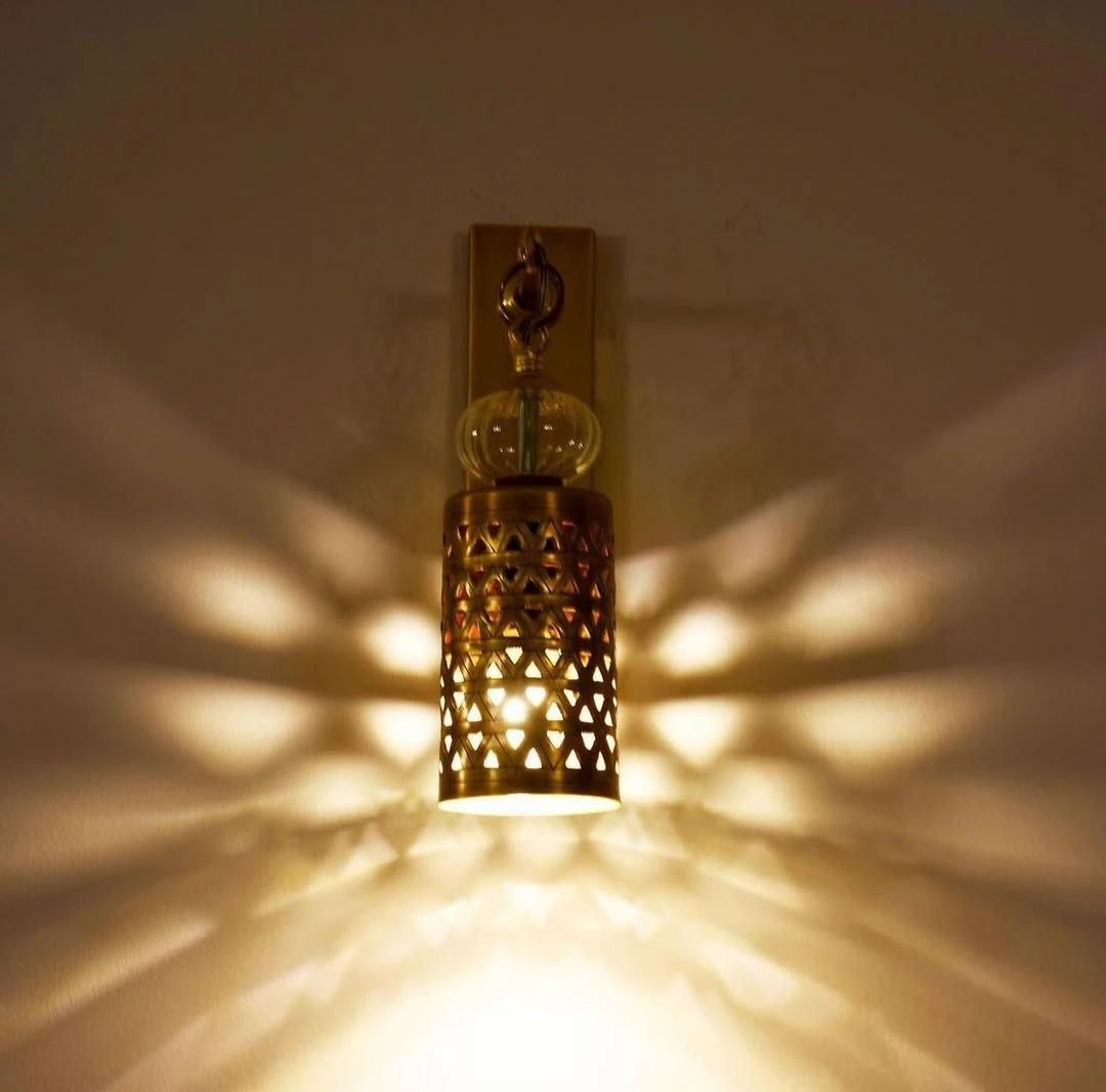 أبليك حائط نحاسي وزجاج من المشكاة، يمتاز بتصميم يجمع بين فخامة المعدن النحاسي وشياكة الزجاج المعالج، ليمنح غرف النوم أو الممرات إضاءة مريحة ولمسة جمالية فريدة تعكس ذوقك الرفيع.